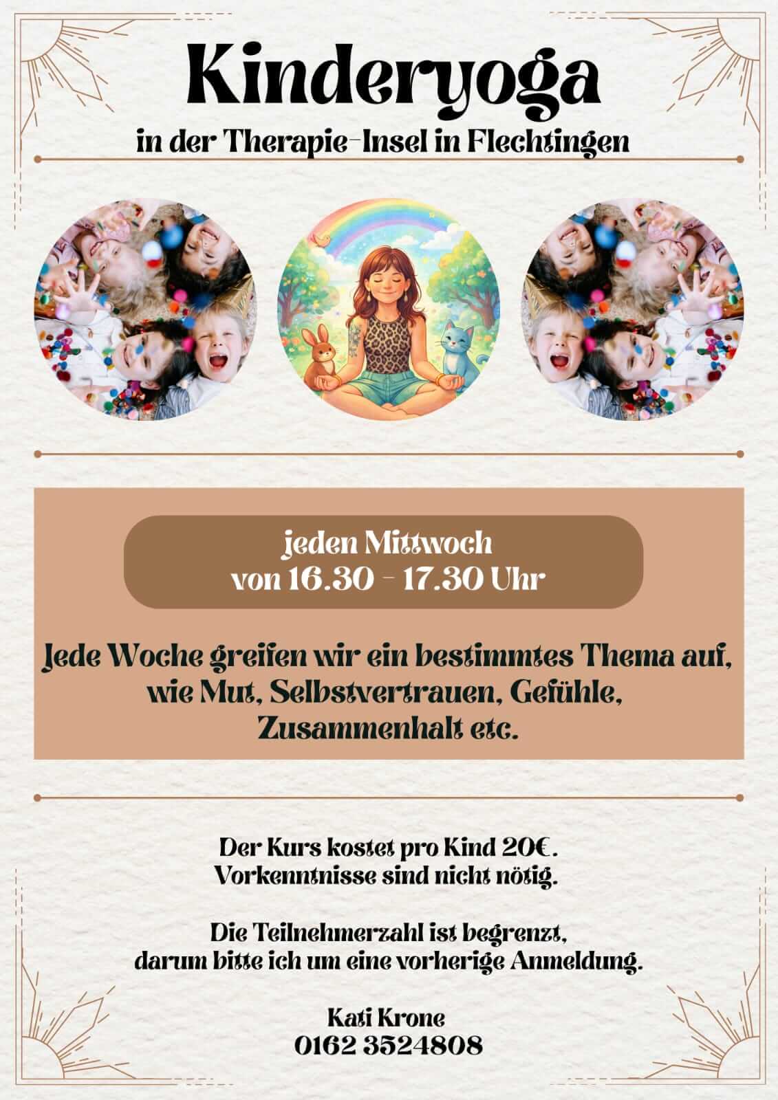 Der Kurs findet jeden Mittwoch von 16:30 bis 17:30 Uhr statt. Jede Stunde steht unter einem bestimmten Thema, das kindgerecht und kreativ aufgegriffen wird. Inhalte wie Mut, Selbstvertrauen, der Umgang mit Gefühlen oder Zusammenhalt werden durch Yoga-Übungen, kleine Rituale und Entspannungsphasen erfahrbar gemacht. Dabei geht es nicht um Leistung, sondern um Freude an Bewegung, innere Ruhe und das Stärken des eigenen Selbstwertgefühls.